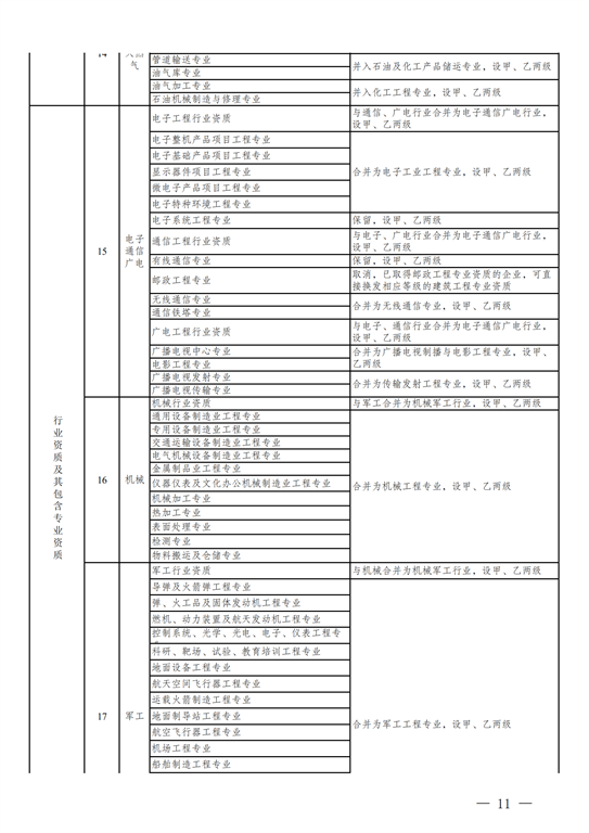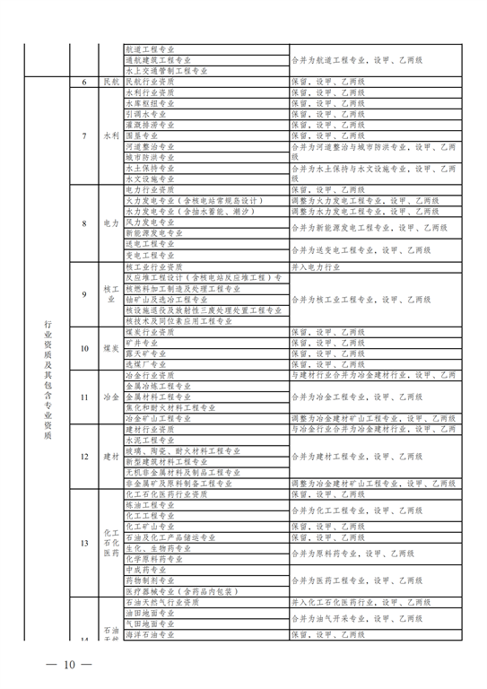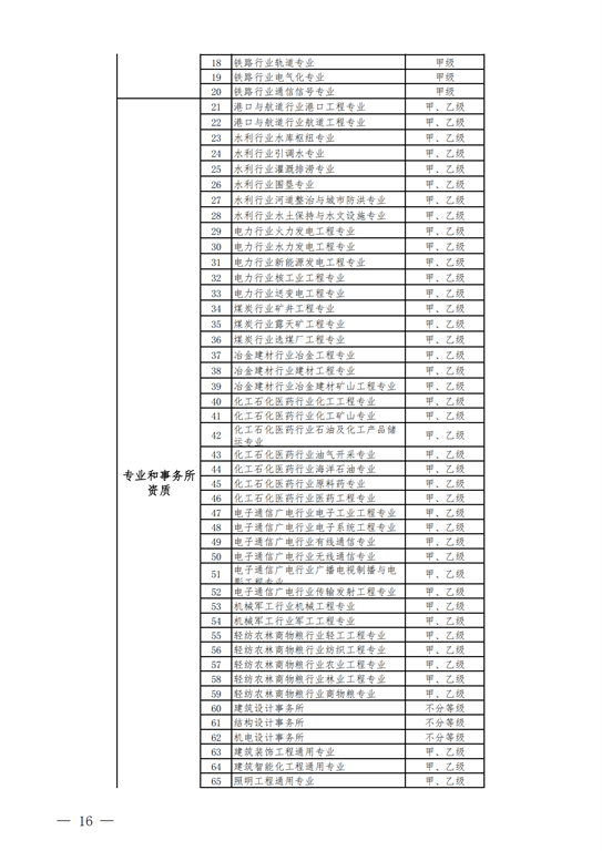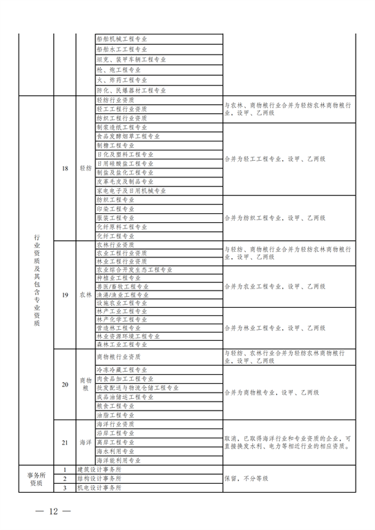 2.工程設(shè)計(jì)資質(zhì)。保留綜合資質(zhì);將21類行業(yè)資質(zhì)整合為14類行業(yè)資質(zhì);將151類專業(yè)資質(zhì)、8類專項(xiàng)資質(zhì)、3類事務(wù)所資質(zhì)整合為70類專業(yè)和事務(wù)所資質(zhì)。綜合資質(zhì)、事務(wù)所資質(zhì)不分等級(jí);行業(yè)資質(zhì)、專業(yè)資質(zhì)等級(jí)原則上壓減為甲、乙兩級(jí)(部分資質(zhì)只設(shè)甲級(jí))。