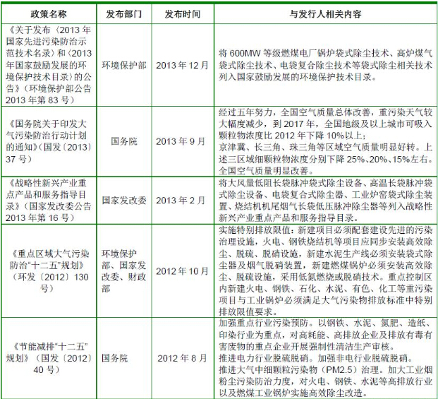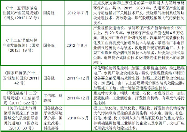 根據(jù)《國務(wù)院關(guān)于印發(fā)大氣污染防治行動計劃的通知》(國發(fā)〔2013〕37號)的要求,到2017 年,全國地級及以上城市可吸入顆粒物濃度比2012 年下降10%以上;京津冀、長三角、珠三角等區(qū)域細(xì)顆粒物濃度分別下降25%、20%、15%左右;加快重點行業(yè)脫硫、脫硝、除塵改造工程建設(shè)。所有燃煤電廠、鋼鐵企業(yè)的燒結(jié)機和球團生產(chǎn)設(shè)備、石油煉制企業(yè)的催化裂化裝置、有色金屬冶煉企業(yè)都要安裝脫硫設(shè)施,每小時20 蒸噸及以上的燃煤鍋爐要實施脫硫。除循環(huán)流化床鍋爐以外的燃煤機組均應(yīng)安裝脫硝設(shè)施,新型干法水泥窯要實施低氮燃燒技術(shù)改造并安裝脫硝設(shè)施。燃煤鍋爐和工業(yè)窯爐現(xiàn)有除塵設(shè)施要實施升級改造;京津冀、長三角、珠三角等區(qū)域要于2015 年底前基本完成燃煤電廠、燃煤鍋爐和工業(yè)窯爐的污染治理設(shè)施建設(shè)與改造,完成石化企業(yè)有機廢氣綜合治理。